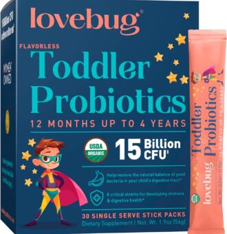 Original price was: $11.89.$9.59Current price is: $9.59.Lovebug Toddler Probiotics – Organic Probiotic for Kids, with Fiber for Constipation Relief, Dissolvable Powder, Ages 12 Months to 4 Year Olds – 30 Pack
