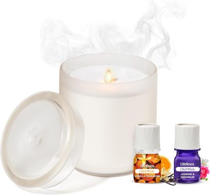 Lifelines Flameless Candle Aromatherapy Essential Oil Diffuser with 2 ClickWick Essential Oil Blends – Cordless & Waterless Diffuser for Home – Scented Electric Candles Blow Out Flame – Frosted Cream