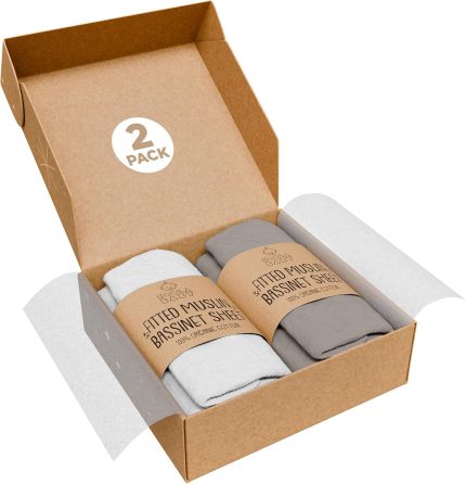 Bassinet Fitted Sheets – Compatible with 4moms MamaRoo Sleep Bassinet | 100% Organic Muslin Cotton – White + Grey | 30×18 (2 Pack)