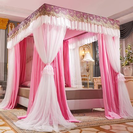 4 Corners Post Bed Canopy, Princess Mosquito Net with Frame, Double Layer Canopy Bed Curtain, Bedroom Decoration Accessories for Girls Bed,Pink,180×220×200cm