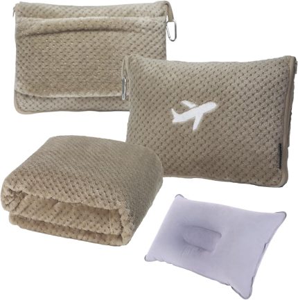 3 in 1 Travel Blanket Pillow Set – 350 GSM Thick Travel Blanket Airplane Compact with Bag, Soft Bag with a Pocket, Inflatable Travel Pillow for Camping & Car Trip (Light Coffee)
