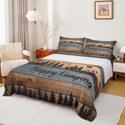 Happy Camping Bed Sheets Full Camper Sheet Set For Kids Adults,Rv Accessories Bedding Set For Travel Trailers Rustic Farmhouse Fitted Sheet Mountain Pine Trees Decor Flat Sheet 2 Pillow Cases
