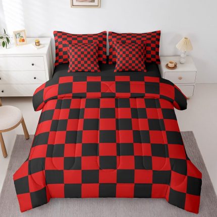 Feelyou Checkered 7 Piece Bedding Set Teen Red Black Plaid Comforter Set with Sheets Queen Size Kids Boys Cute Retro Neutral Checkerboard Geometric Bed in a Bag Vintage Aesthetic Room Decor