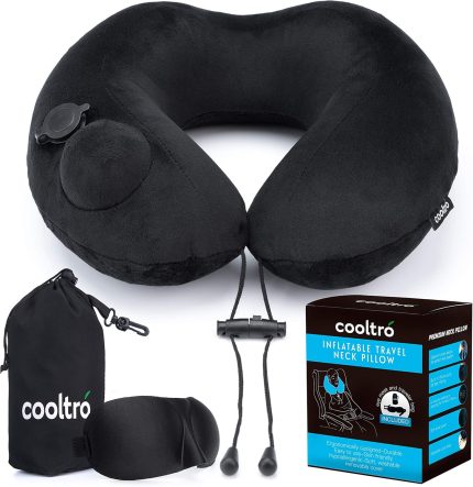 Inflatable Travel Neck Pillow for Airplanes by cooltro | Premium Flight Pillow plus 3D Eye Mask plus Carry Pouch with carabiner