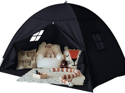 Full Size Bed Tent Canopy: Lights & Flags Indoor Floor Bed Kids Tent Playhouse – Space Blackout Sleeping Tents Indoor Breathable Portable Cottage Drafty Room Floor (Large Black)