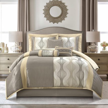 Grand Avenue 7 Piece Grey Gold Comforter Set, California King Size Jacquard Bedding Set, All Season Geometric Patchwork Bedding Set, Matching Pillows, Shams, Bed Skirt
