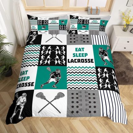 Lacrosse Duvet Cover Queen,Grey Blue Eat Sleep Lacrosse Bedding Set for Kids Boys Girls,Lacrosse Player Comforter Cover Bedroom Decor,Sports Game Buffalo Plaid Bed Sets with 2 Pillowcases