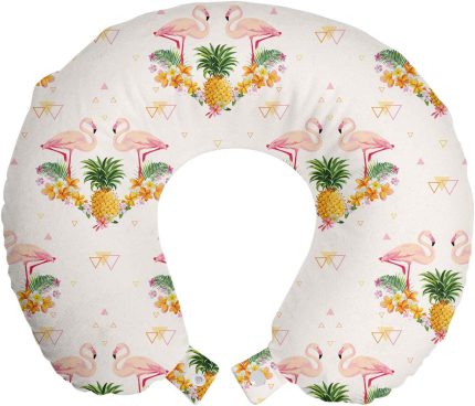 Lunarable Flamingo Travel Pillow Neck Rest, Floral Exotic Summer Birds Pineapple Hawaiian Alohas Bananas Triangles, Memory Foam Traveling Accessory for Airplane and Car, 12″, Yellow Green and Pink