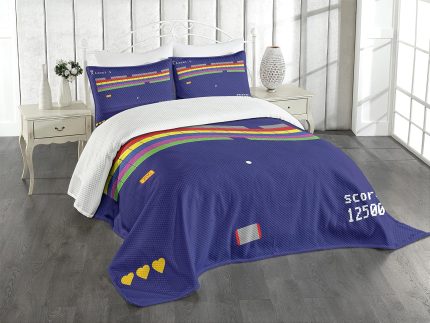 Lunarable Vintage Bedspread, Playful Arcade Design Colorful Square Shapes Super Mario Funny Modern Graphic, Decorative Quilted 3 Piece Coverlet Set with 2 Pillow Shams, Queen Size, Violet Blue