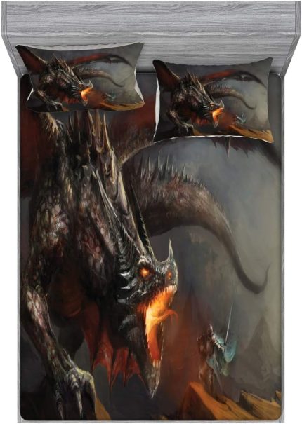 Lunarable Medieval Fitted Sheet & Pillow Sham Set, Fantasy Scene Fearless Knight Dragon Art Antique Surreal, Decorative Printed 3 Piece Bedding Decor Set, Queen, Dimgray Charcoal
