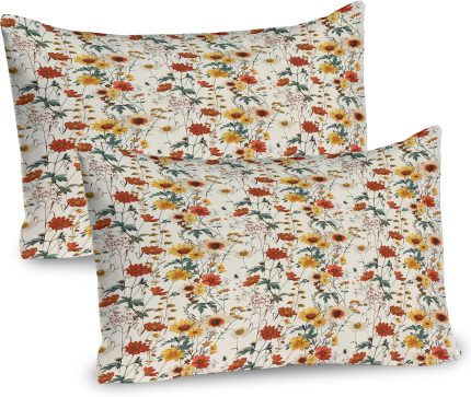 Lunarable Fall Pillow Sham Set of 2, Vintage Autumnal Theme Farmhouse Vibe Wild Flowers Illustration Print, Quality Microfiber Bedding Item for All Seasons, 26″ x 20″, Beige Cinnamon and Mustard