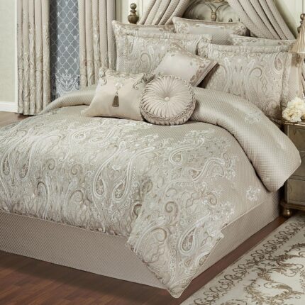 Lunata Luxury Bedding | Neutral Hues | Jacquard-Woven Scrollwork | 11 Pc Bed Set: Oversized Cal King Comforter, Bedskirt, 2 King Shams, 2 Euro Shams, 2 Euro Pillow Inserts, and 3 Decorative Pillows
