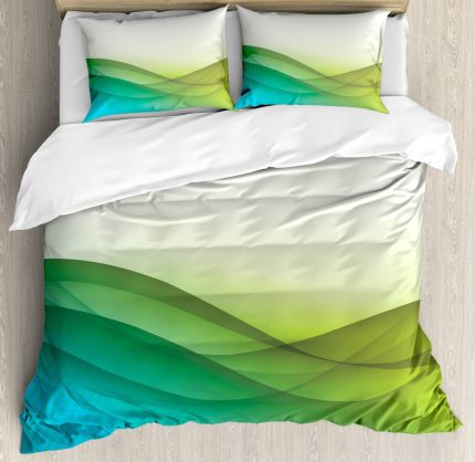 Lunarable Abstract Duvet Cover Set, Modern Circled Wavy Like Green Color Rainbow Seem Ombre Artwork, Decorative 3 Piece Bedding Set with 2 Pillow Shams, Queen Size, Yellow White