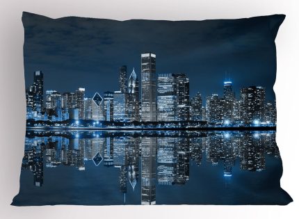 Ambesonne Chicago Skyline Pillow Sham, Sleeping City Dramatic Urban Resting Popular American Lake Picture, Decorative Standard Size Printed Pillowcase, 26″ X 20″, Night Blue Grey