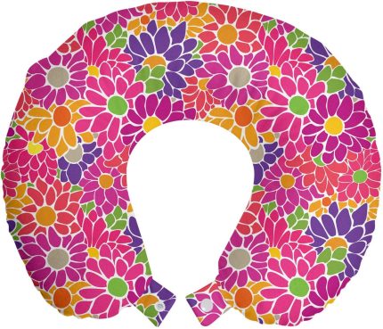 Ambesonne Floral Travel Pillow Neck Rest, Rhythmic 90’s Style Simplistic Retro Flair Drawn Colorful Arrangement, Memory Foam Traveling Accessory for Airplane and Car, 12″, Hot Pink and Multicolor