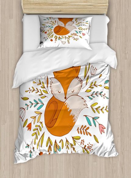 Ambesonne Cartoon Duvet Cover Set, Fox Sleeping in a Floral Made Bed Circle Art Print, Decorative 2 Piece Bedding Set with 1 Pillow Sham, Twin Size, Dark Orange White