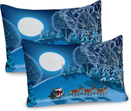 Ambesonne Christmas Pillow Sham Set of 2, Santa in Sleigh a Night Full Moon The Sky Snowy Winter Xmas Theme Print, Quality Microfiber Bedding Item for All Seasons, 30″ x 20″, Navy Blue
