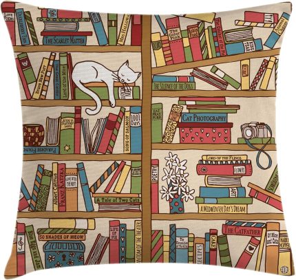 Ambesonne Cat Throw Pillow Cushion Cover, Nerd Book Lover Kitty Sleeping Over Bookshelf Library Academics Feline Boho Design, Decorative Square Accent Pillow Case, 24″ X 24″, Brown Pink
