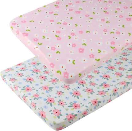 Pack n Play Playard Fitted Sheets 2 Pack Set for Baby Girl Soft Stretchy Jersey Knit Portable Mini Crib Mattress Cover, Pink Floral
