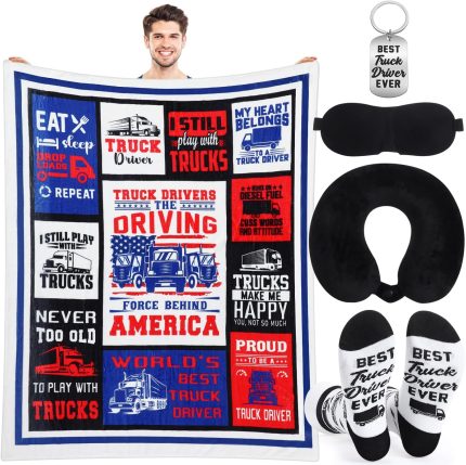 Set Truck Driver Gifts for Men Dad Truck Driver Appreciation Gifts Throw Blanket 60″ x 50″, Pillow, Eye Mask, Cotton Socks and Keychain for Father Day