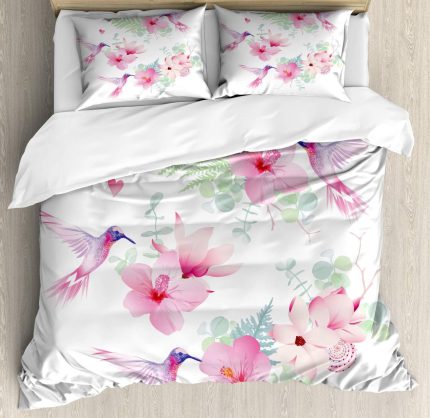 Ambesonne Hummingbirds Duvet Cover Set, Tropical Summer Flying Avian Animal Theme Wild Nature Theme, Decorative 3 Piece Bedding Set with 2 Pillow Shams, King Size, Pink Purple
