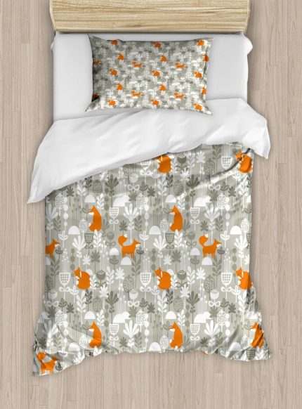 Ambesonne Fox Duvet Cover Set, Woodland Animals in Flower Field Cartoon Sleeping Forest Fauna, Decorative 2 Piece Bedding Set with 1 Pillow Sham, Twin Size, Orange Pale Sage Green