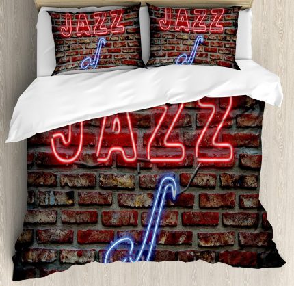 Ambesonne Music Duvet Cover Set, Image of Alluring Neon All Jazz Sign with Saxophone Instrument on Brick Wall Print, Decorative 3 Piece Bedding Set with 2 Pillow Shams, King Size, Taupe Grey