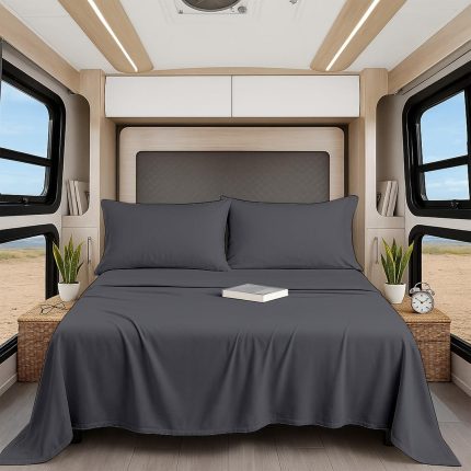 Shreem Linen Luxury 4 Piece Microfiber RV Sheet Set, Deep Pocket Fits Up to 10 inch, Soft, Wrinkle-Resistant, Camper, Travel Trailer Bedding, Camper Queen 60×80, Dark Grey