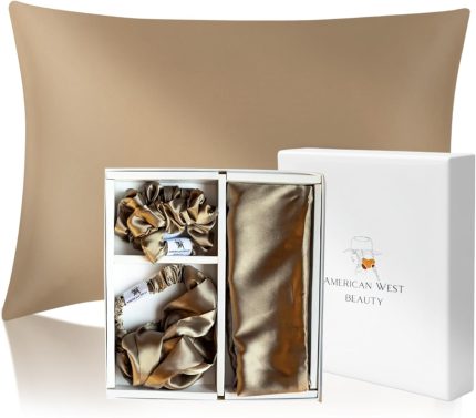 Stain Silk Pillowcase Gift Set for Women | Soft & Smooth Pillow Case | Spa Headband and Scrunchies | Silk Hair Scrunchies & Luxury Hair Accessories for Women | 4 Pieces Gift Set – Gold