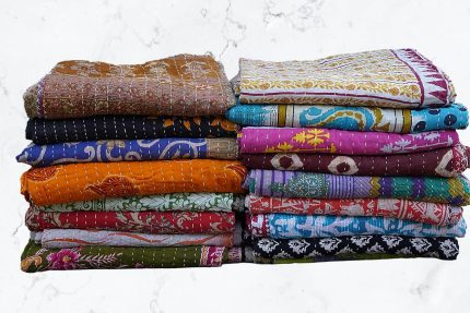 Twin Cotton Quilt, 4 pcs Reversible Vintage Bedspreads, Kantha Stitch Blanket, Hand Embroidered Gudari, Multicolor, 85x55Inch, Dry Clean Only