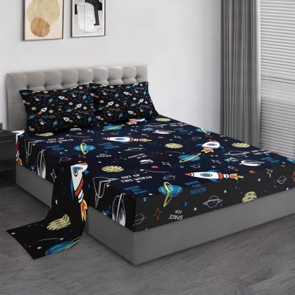 Twin Size Bed Sheet Sets, Space Moon Universe 3 Pcs Bedding Sets for Kids and Adults Bedroom Bed Decor, Rockets Planets Stars Flat, Fitted Sheet and 2 Pillowcases