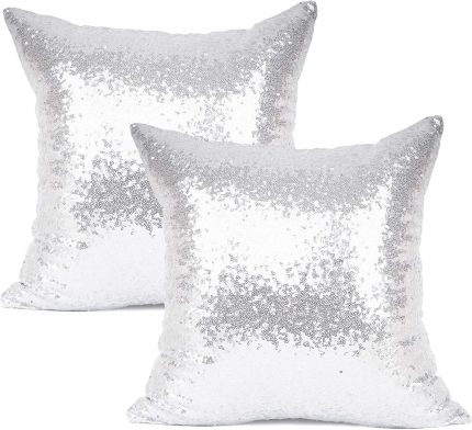 YOUR SMILE Pack of 2, New Luxury Series Silver Decorative Glitzy Sequin & Comfy Satin Solid Throw Pillow Cover Cushion Case for Wedding/Christmas,18″ x 18″