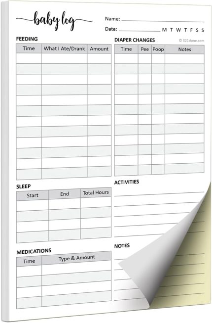 321Done 2-Part Carbonless Baby Daily Log Book, Made in USA – 5.5×8.5 Pad, Newborn Feeding, Diaper, Sleep & Medication Tracker for Parents, Babysitters & Daycare – Daily Infant Tracker – 50 Sets