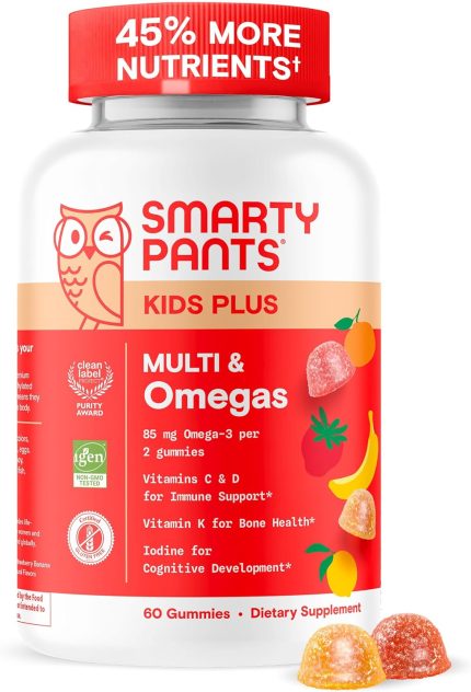 SmartyPants Kids Multivitamin Gummies – Improved Formula: Omega 3 (DHA/EPA), Vitamins D3, C, B12, B6, Vitamin A, K & Zinc, Gluten Free, Three Fruit Flavors, 60 Count (30 Day Supply)