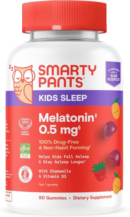 SmartyPants Kids Sleep Gummies Supplement with Melatonin 0.5mg: Chamomile & Vitamin D3, Sleep Aid, Strawberry Mango Flavor, 60 Count