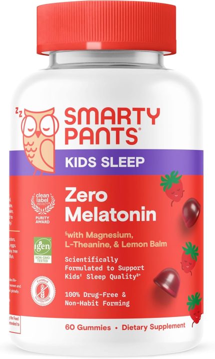 SmartyPants Kids Sleep Gummies Supplement Zero Melatonin: L Theanine, Lemon Balm & Magnesium, Sleep Aid, Strawberry Flavor, 60 Count