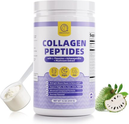 Collagen Peptides* Powder for Women, Night Repair, Support Skin, Hair, Nail, Marine Collagen Supplements with Hydrolyzed Type I, L-Theanine, Ashwagandha, Mushroom, Soursop Flavored, 450g/16oz