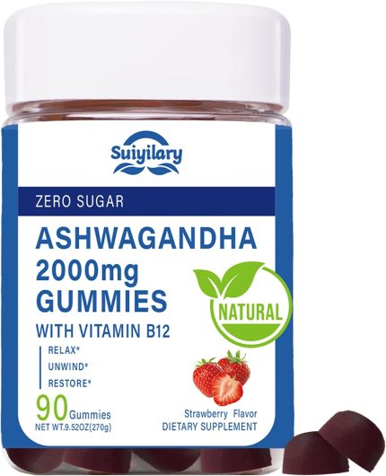 Suiyilary Ashwagandha Gummies 2000mg, Ashwagandha High Strength Root Extract Supplement with Vitamin B12 for Men Women, Strawberry Flavour 45 Days Supply 90 Gummies