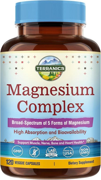 Terranics 5-in-1 Magnesium Complex Supplement 500mg – 5 Forms High Absorption Magnesium Glycinate Citrate Malate Aspartate Gluconate – Non-GMO 120 Vegan Magnesio Capsule for Sleep Muscle Heart Health