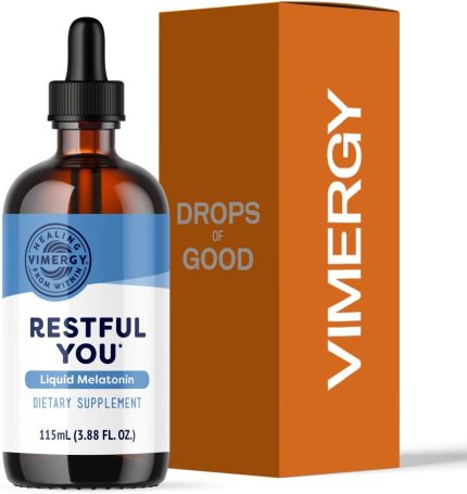 Vimergy Restful You* Liquid Melatonin – Fast-Absorbing Support for Restorative Sleep. Customizable Serving Size. Kosher, Vegan, Paleo-Friendly, Non-GMO. Serving Size: Adults 1mL, Kids 0.2mL.