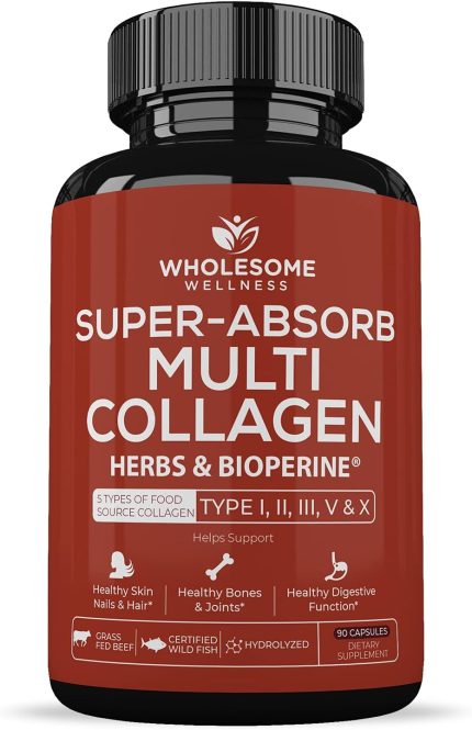 Wholesome Wellness Super-Absorb Multi Collagen Pills (Type I II III V X) Organic Herbs & Bioperine – Hair, Skin, Nails – Hydrolyzed Peptides Protein Supplement for Women & Men (90 Capsules)
