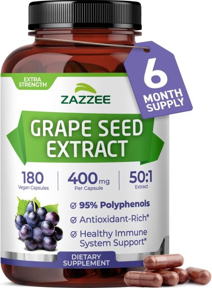 Zazzee High Strength Grape Seed 50:1 Extract, 180 Vegan Capsules, 95% Polyphenols, 400 mg per Capsule, 6 Month Supply, Standardized and Concentrated 50X Extract, Non-GMO, Made in The USA