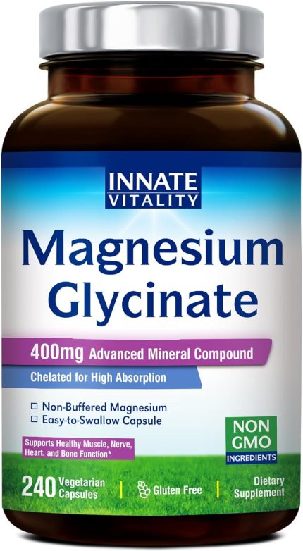 Innate Vitality Magnesium Glycinate 400mg, Non Buffered & High Absorption Magnesium Supplement for Sleep, Relaxation, Muscle & Bone Health for Men & Women, Non-GMO, No Gluten, 240 Vegan Capsules