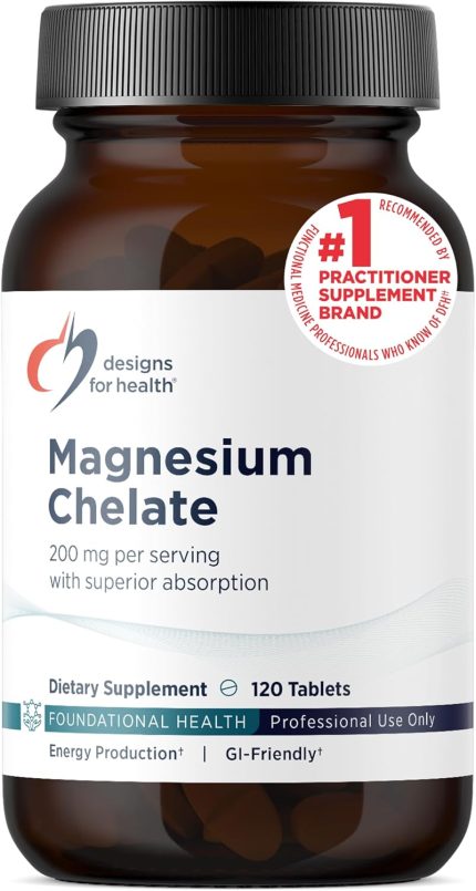 Designs for Health Magnesium Chelate Tablets – 200mg Magnesium Bisglycinate Chelate – Non-GMO Supplement Designed to be Easier on the Stomach (120 Tablets)