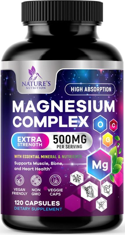Magnesium Complex Capsules – 500mg per Serving Magnesium – High Absorption Chelated Mineral Supplement – with Oxide, Glycinate, Malate, Citrate for Muscle Bone and Heart Health Support – 120 Capsules