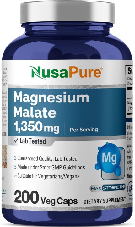 NusaPure Magnesium Malate 1350mg 200 Veggie Capsules (Vegan, Non-GMO, Vegan)