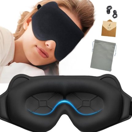 3D Contoured Sleep Mask for Side Sleepers & Travel – 100% Light Blocking Cat-Eye Design, 20mm Deep Eye Cavity & Adjustable Headband | Black Sleep Mask with Earplids, Gift Card & Pouch (Black)