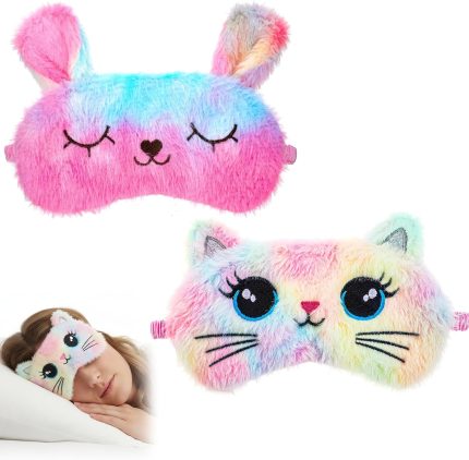 2 PCS Sleep Mask for Kids, Super Soft Plush Cute Cat Sleeping Eye Mask, Comfortable Adjustable Blindfold for Girls, Funny Animal Light Blocking Night Cover for Home Travel (Cat Pattern)