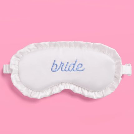 xo, Fetti Ruffled Bride Sleep Mask, White Satin + Blue Embroidery | Bachelorette Party Decorations, Bridal Shower Accessory, Bride to Be Party Favor, Bridesmaid Gift