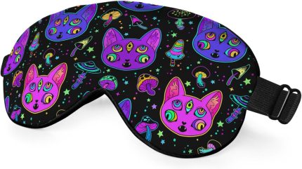 Cat Mushrooms Silk Eye Mask Sleep Mask Bright Psychedelic Cat Halloween Black Eye Mask with Adjustable Strap Lightweight for Women Work Travel Night Sleep